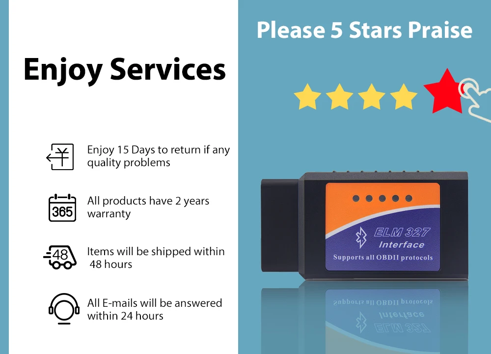 ELM327 был предоставлен 15 дней возврата и полной технической поддержки, если есть какие-либо проблемы, пожалуйста, свяжитесь с нами для поддержки