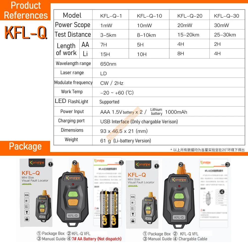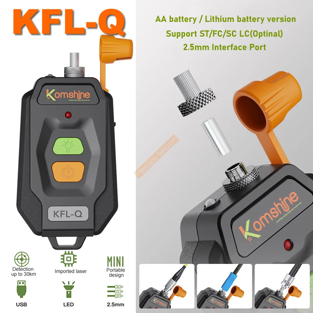 KomShine KFL-Q Карманный визуальный локатор неисправностей/Проверка/локатор разрыва волокна является надежным, экономически эффективным OTDR dead-zone инструментом. Этот VFL определяет волокна от конца до конца и легко размещает отполированные концы соединителя. Он имеет универсальный разъем, на котором удобно хранить 2,5 мм наконечники ....