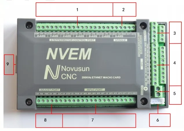 Подключение контроллера включает в себя интерфейс источника питания, интерфейс подключения Ethernet, mpgинтерфейс, выходной интерфейс шагового/серводвигателя, выходной интерфейс управления шпинделем, Estop и ограниченный переключатель, а также входной интерфейс настройки инструмента и так далее. Теперь мы описываем их в деталях, как показано ниже.