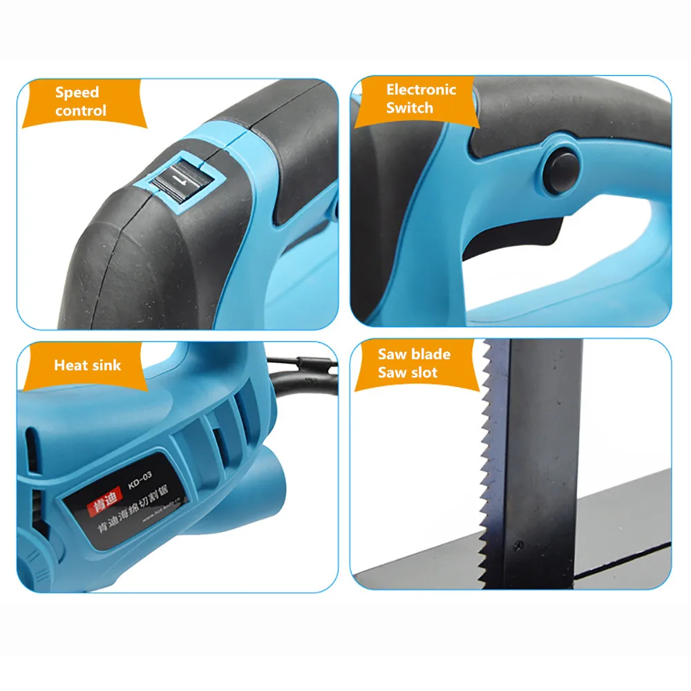 Параметр: Модель: KD-03 Название продукта: электрическая пила для резки губки Напряжение: 220 В переменного тока/50 Гц Мощность: 570 Вт Скорость: 0-3200 об/мин Самая толстая резка: 150 мм Вес: 3 кг Характеристика: 1. Это профессиональный резак для пены, который подходит для большинства форм подушки. 2. Лопасти для резки пены с регулируемой скоростью (не тепловое лезвие). 3. Легко режет острые повороты. Легко вырезайте подушки в форме буквы «T» или «L». 4. Двойной резак для пены, резины лезвия с одним перемещение гарантирует плавное, точный порезов. 5. Съемное основание с скользящими роликами. Упаковочный лист: 1 x губчатая пила 1 x пильный диск 1 х гаечный ключ
