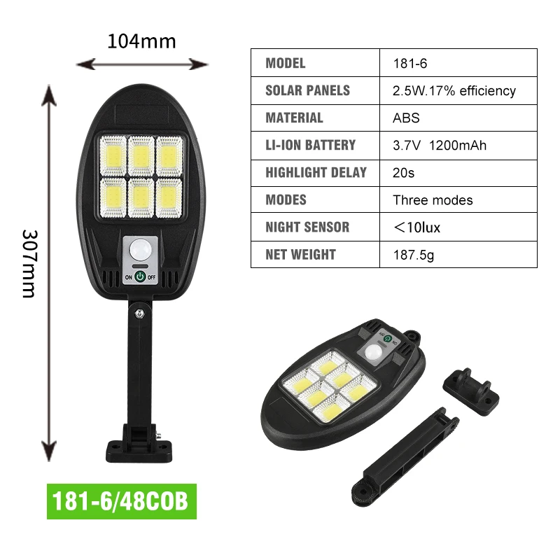 Модель: Светодиодная лампа 48COB Солнечная панель: 5,5 В/2,5 Вт Материал: АБС Режим работы: светильник сразу после наступления темноты Задержка подсветки: 20 с Угол освещения: 360 ° Батарея: Встроенная перезаряжаемая литиевая батарея Вес нетто: 260 г Размер модели: 220 мм * 180 мм Режимы: 3 режима