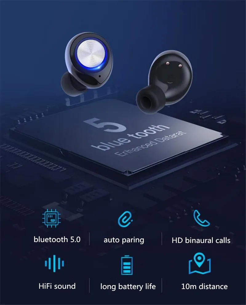 Функция сенсорного управления TW60 (беспроводная гарнитура Bluetooth 5,0)Нажмите: пауза/воспроизведениеНажмите: принять/отклонитьДлительное нажатие, чтобы отклонить вызовПредыдущий трек: дважды нажмите на левое ухоСледующий трек: дважды нажмите на правое ухоГромкость +: Нажмите левое ухо 3 разаГромкость-: нажмите на правое ухо 3 разаГолос: Длительное нажатие в течение 3 секундУпаковкаПодарочная коробка:1 * TW60 TWS Bluetooth наушники1 * чехол для зарядки1 * зарядный кабель Type-C1 * Руководство пользователя3 * силиконовые наушникиПараметры продукта1. Чип: CSR V5.02. Эффективное расстояние прямой линии: 10 метров3. Блок привода: высококачественный Графен динамик с диаметром динамика 6 мм.4. Батарея: полимерная литиевая батарея, наушники 45 мАч, полностью кобальтовая батарея, зарядный отсек 400 мАч (с защитной панелью)5. Время работы: 4 часа для одного наушника и 3 часа для обоих наушников.6. Время работы в режиме ожидания: 100 Ч для одного наушника, 60 ч для обоих наушников7. Время полной зарядки: около 70 минут для наушников, около 2 часов для зарядки склада