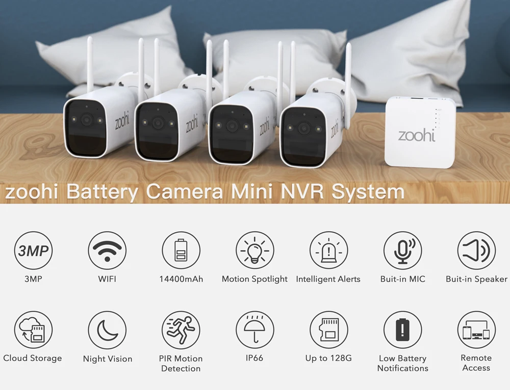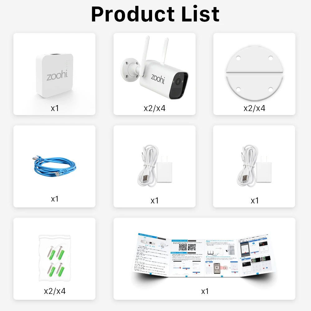 · 4 камеры 128 ГБ Солнечная = 4x камера + мини NVR + 1x128 ГБ sd-карта + 4x Солнечная панель.