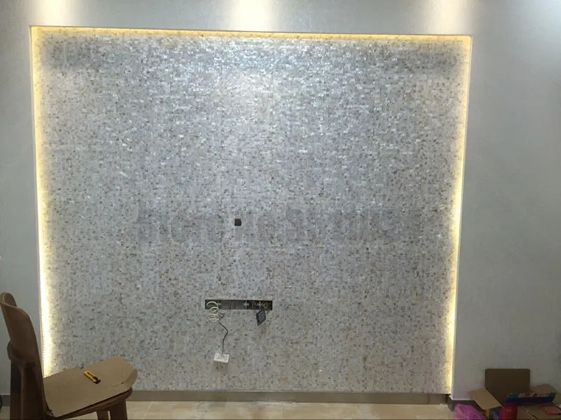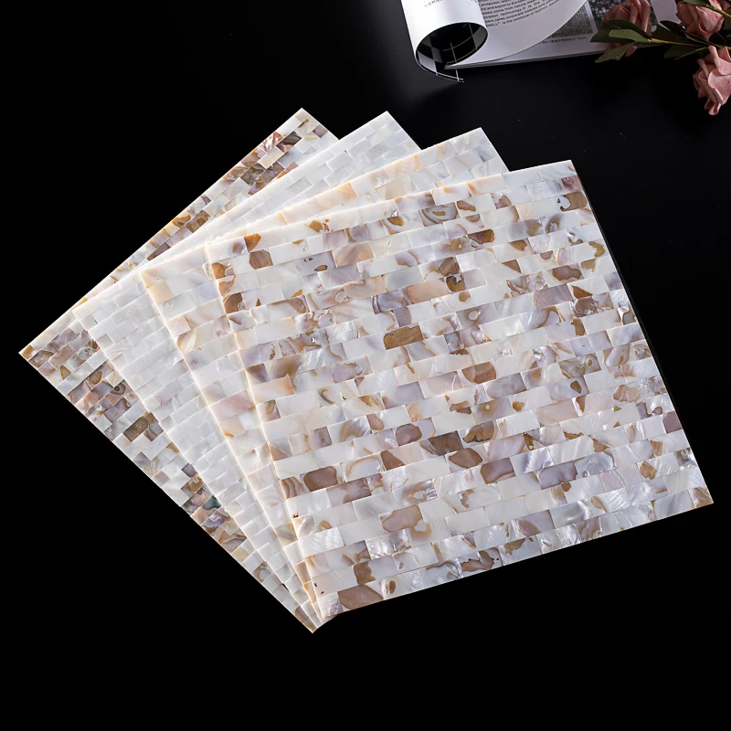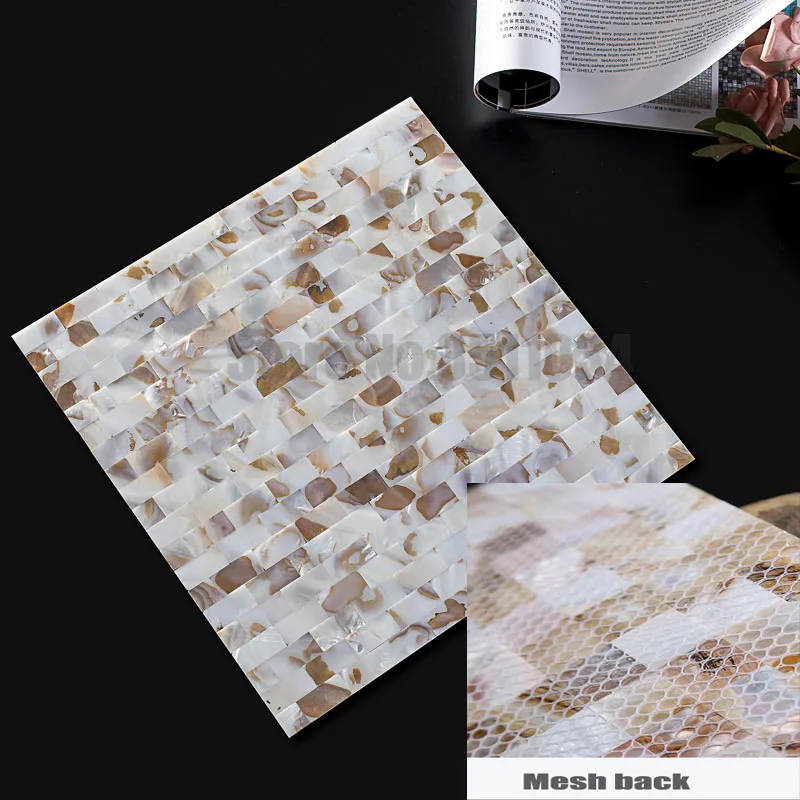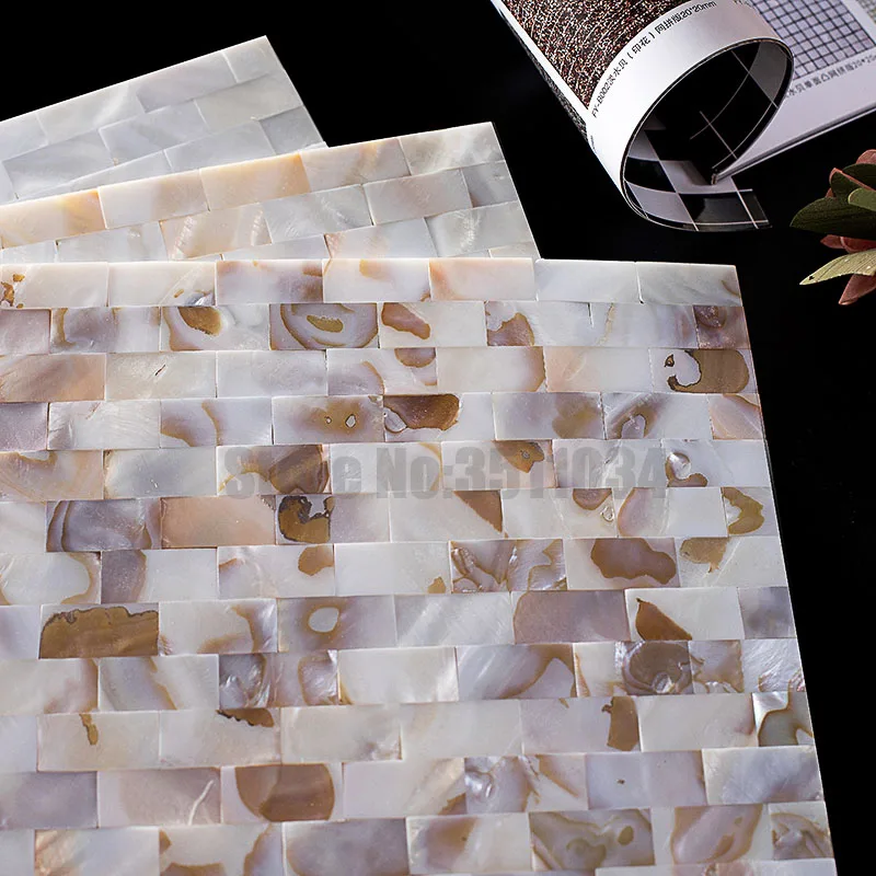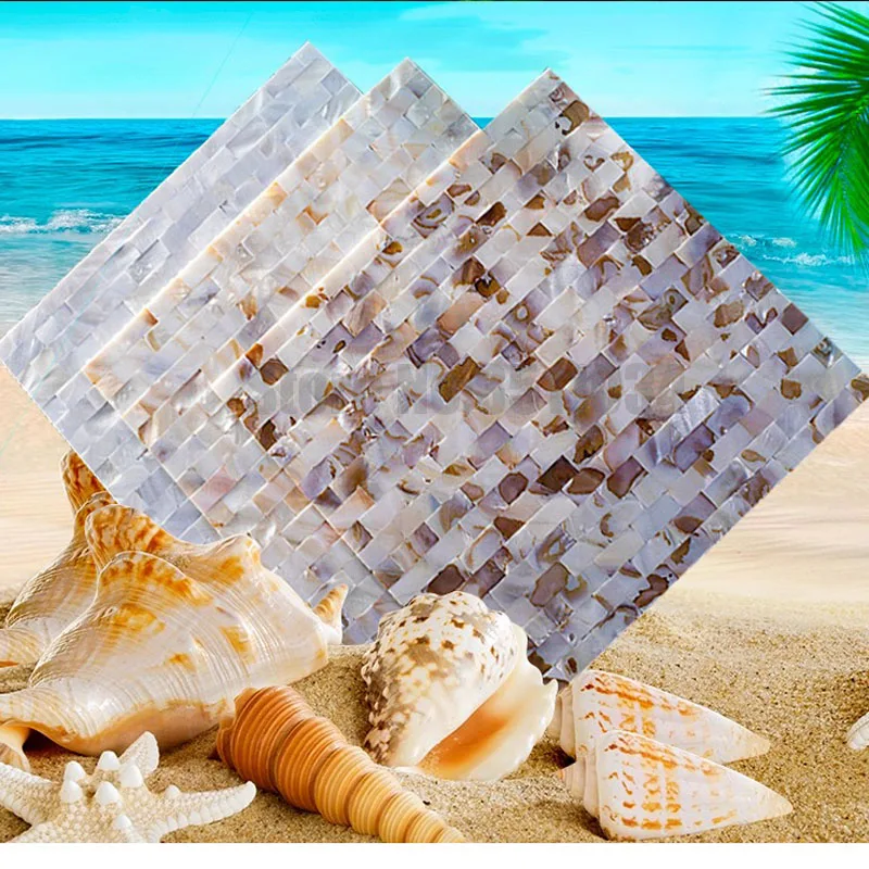 Материал: Натуральный корпусМозаичная плитка оболочки очень популярна в интерьере в последние годы, без загрязнения, без излучения, без выцветания, водонепроницаемая и огнеупорная защита, легкая чистка и поглощение воды почти нулевое