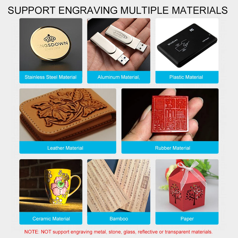 [Поддержка гравировки нескольких материалов s] Нержавеющая сталь, алюминиевый материал, пластик, керамика, дерево, бамбук, бумага, кожа, резина, губчатая бумага и т. д. (не поддерживает гравировку металла, камня, стекло, светоотражающий или прозрачный материал s.)