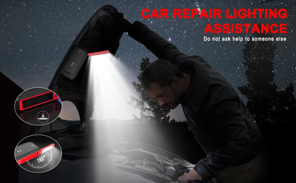 Адсорбция вашего автомобиля капота и шасси при ремонте Не прикасайтесь к стартеру скачка энергично, когда магнитное основание всасывания было высохло. В противном случае стартер спадет Поверните светильник, чтобы настроить себя под удобный угол при необходимости (против часовой стрелки вращение от 0 ° ~ 180 °)