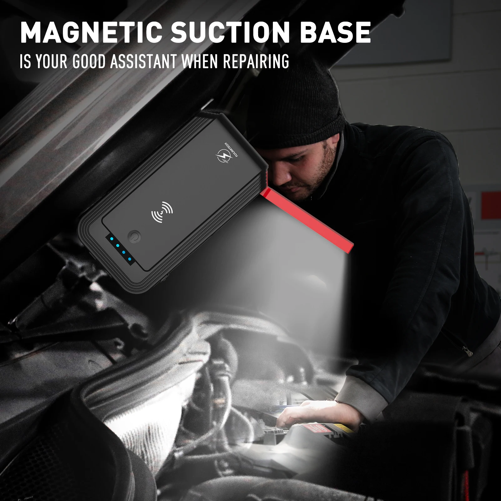 Стартер автомобиля имеет сильную магнитную функцию притяжения и может адсорбироваться на капоте или шасси автомобиля для легкого использования.