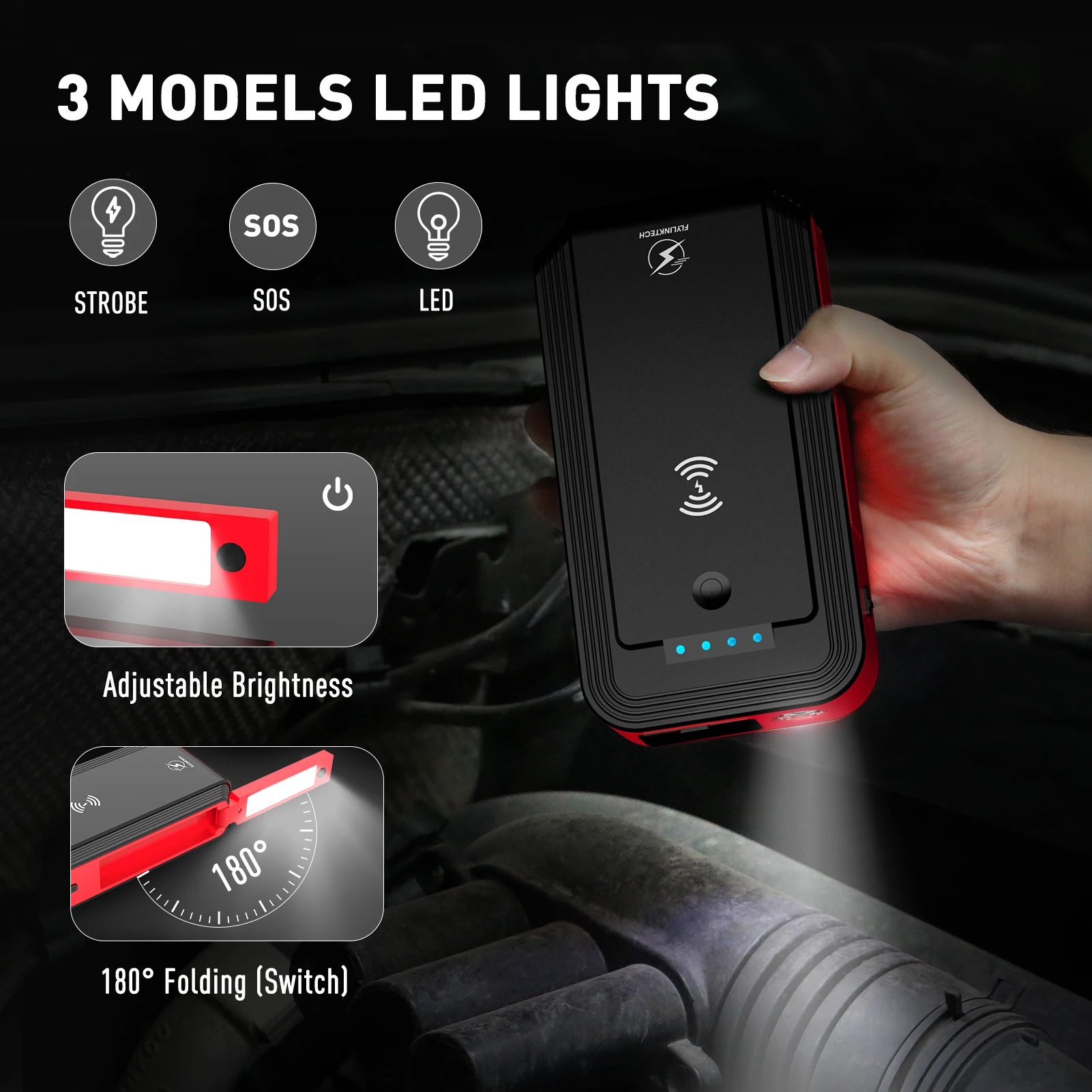 Магнитное основание можно адсорбировать к капоту и шасси для легкого освещения при необходимости. Стартер скачка оснащен супер яркими светодиодами, работающими как аварийный фонарик с тремя режимами (SOS стробоскоп и вспышка). Нормальный срок службы батареи 6-8 лет, вы можете вручную выключить скачок, чтобы замедлить саморазряд батареи, Позволяя к аккумулятору Пусковое устройство для стартера для того, чтобы держать его заряда до 12 месяцев.