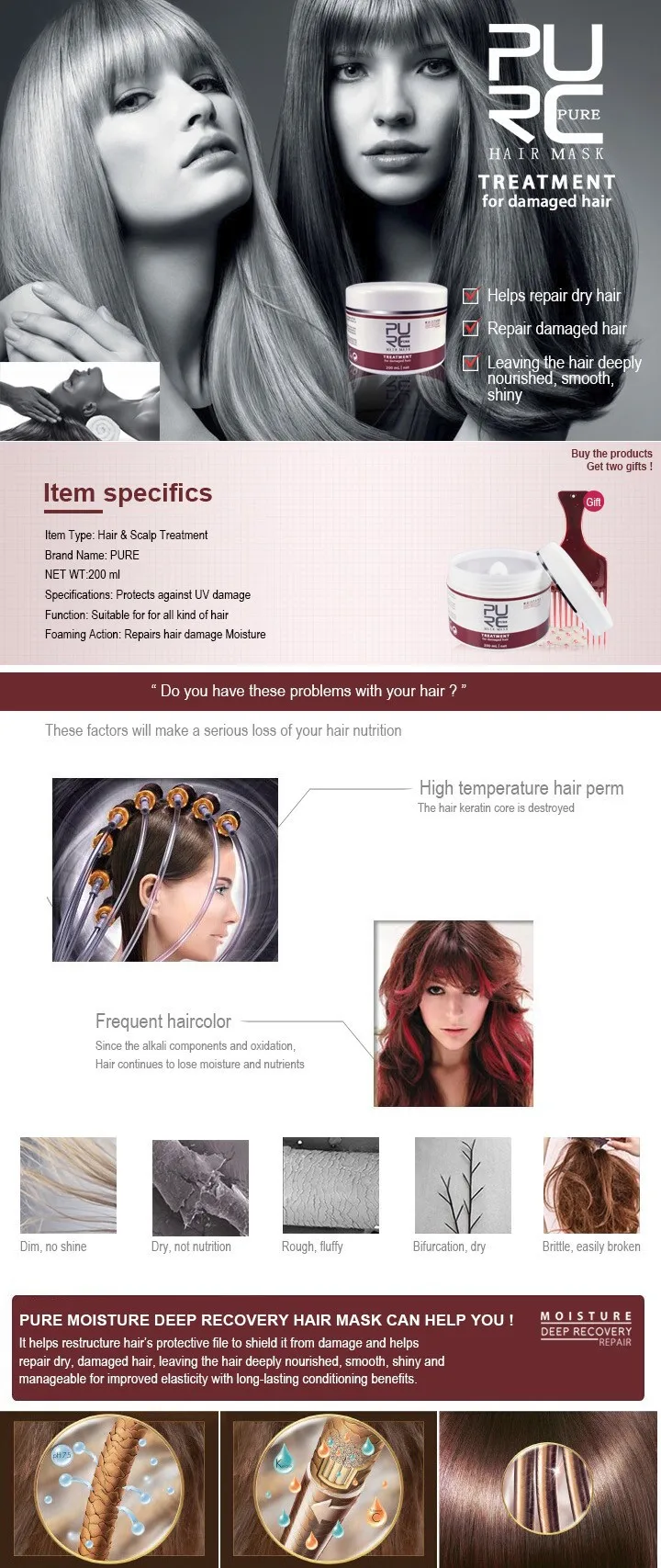 Глубокий кондиционер PURC 200 мл восстанавливает сухие и поврежденные волосы увлажняющая маска против завивки волос маска для волос Восстановление волос уход за волосами
