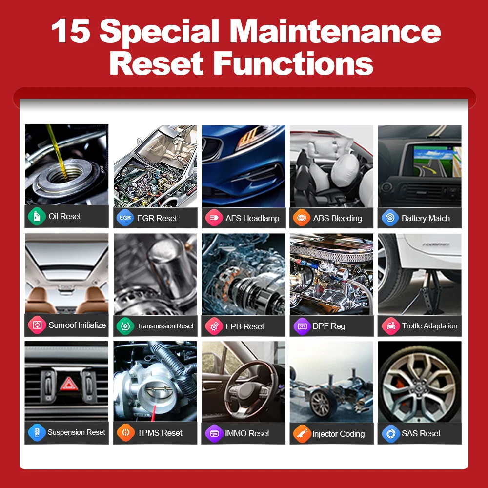 1. Обслуживание сброса масла 2. Калибровка угла поворота руля 3. Электронный сброс стояночного тормоза 4. Регистрация батареи и обслуживание батареи 5. Кровотечение из АБС-пластика 6. Электронный сброс положения дроссельной заслонки и обучение 7. Регенерация дизельных Сажевых фильтров (DPF) 8. Сброс системы контроля давления в шинах 9. Противоугонное соответствие 10. Соответствие инжектора 11. Сброс пневматической подвески 12. Сброс коробки передач 13. Сброс крыш солнца 14. Сброс AFS 15. Сброс EGR