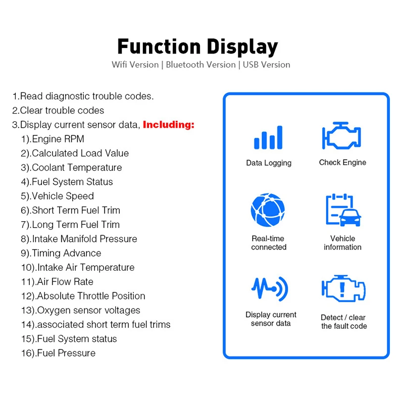 ELM327 V1.5 OBD2 Scanner support Functions List: