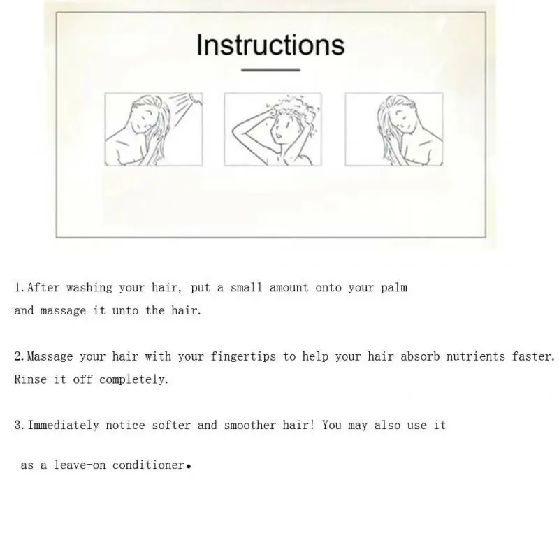 Способ использования: после мытья волос нанесите этот продукт на волосы. Не прикасайтесь к коже головы. Массируйте волосы кончиками пальцев, чтобы помочь волосам быстрее впитывать питательные вещества. Вы обнаружите, что ваши волосы становятся мягкими и гладкими мгновенно! Рекомендуется массировать в течение 2-5 минут, что позволит достичь наилучших результатов!