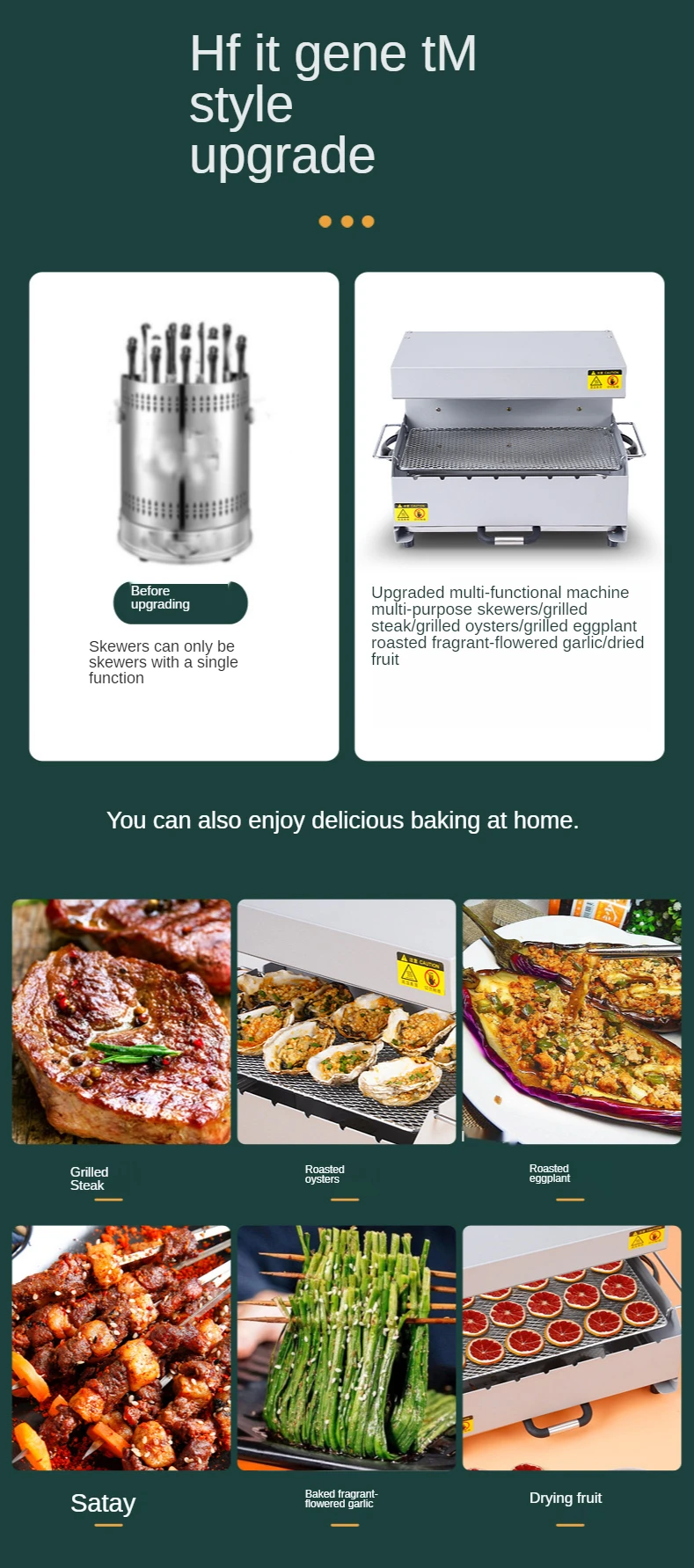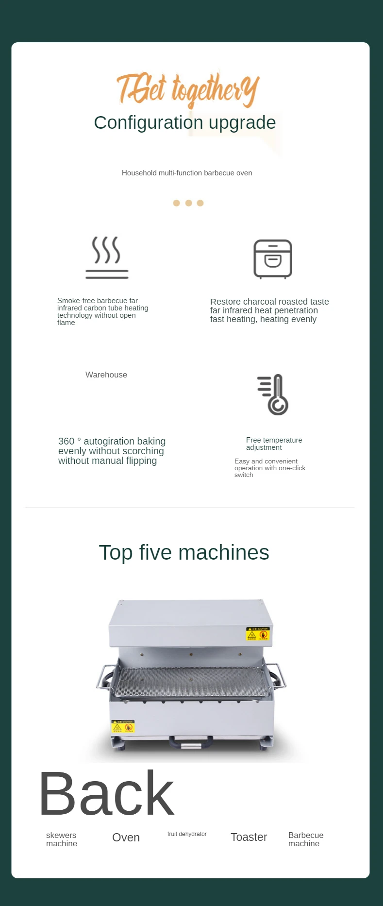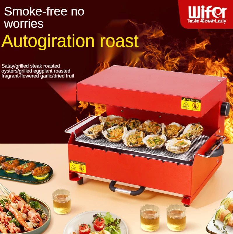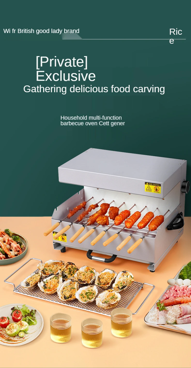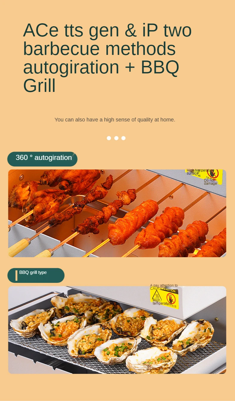 *Smokeless barbecue, restore the taste of charcoal barbecue *Far infrared carbon tube *Far infrared heat penetration *No open flame heating technology *Rapid heating, uniform heating *360°automatic rotating roast * Free temperature adjustment *One key switch *No need to manually flip *Simple and convenient operation *—The first five machines, skewers, oven, dried fruit machine toaster *Two grilling methods, automatic rotation + grilling net *Far infrared x penetration heat *Fast and even heat transfer *Configure two carbon fiber heating tubes *Far infrared can quickly roast cooked ingredients below the smoking temperature *220°C constant temperature barbecue