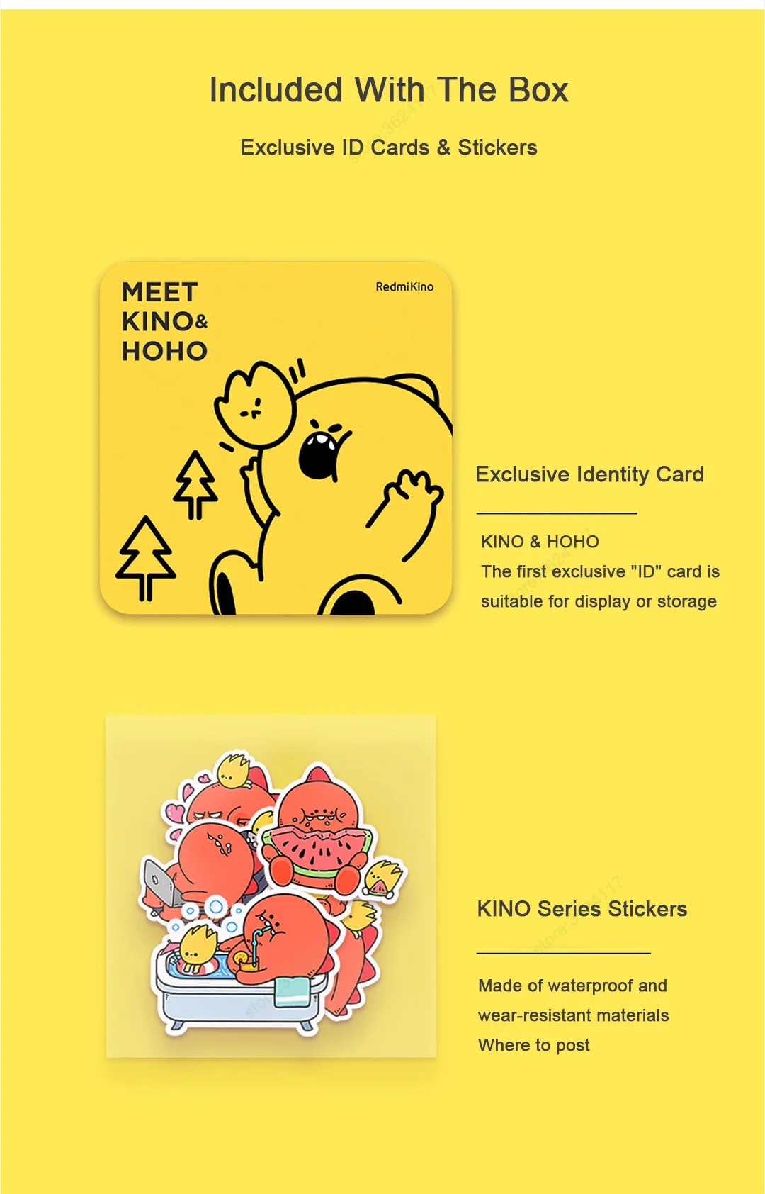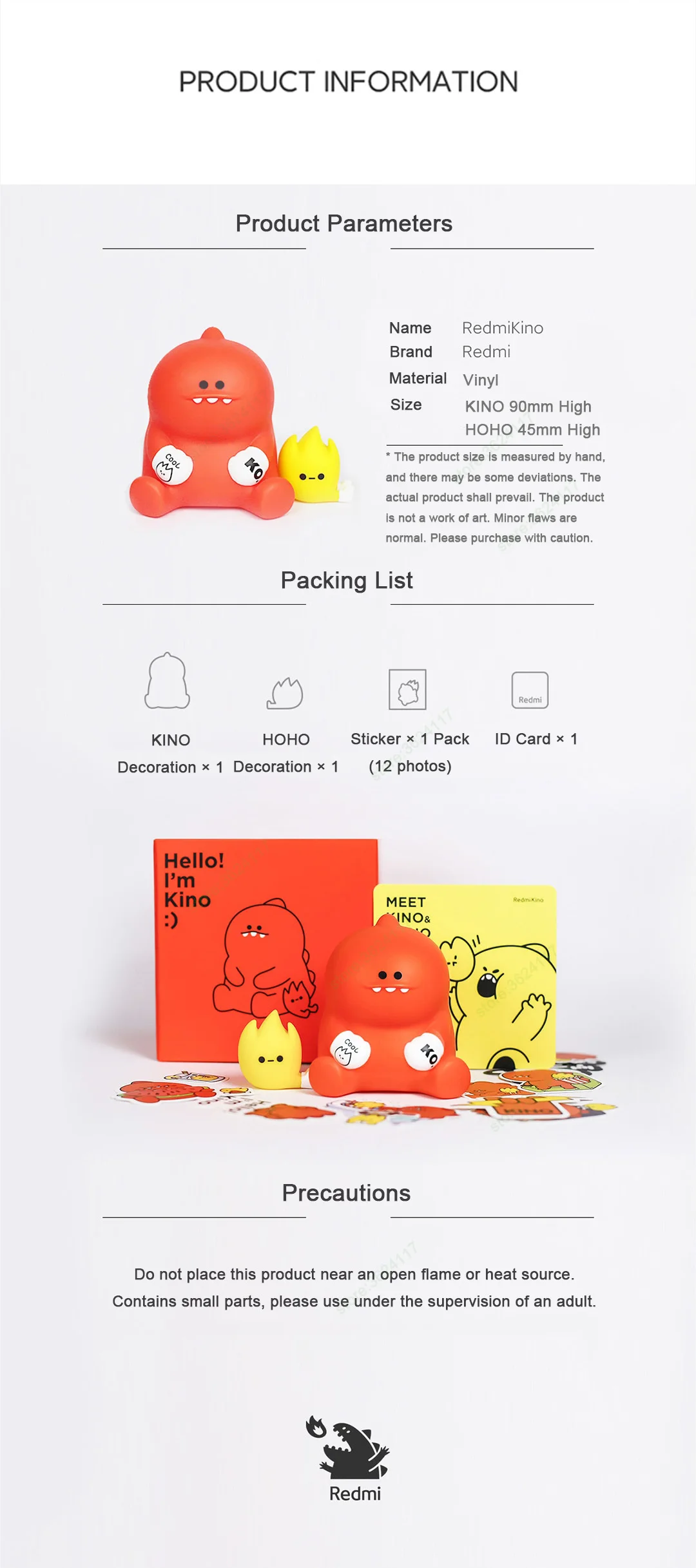 It is Xiaomi ecological chain products ,there is no any Xiaomi LOGO on it,Thanks for your understanding! Product Parameters Name Redmikino Brand Redmi Material Vinyl Size:KINO approximately 90mm high HOHO approximately 45mm high * The product size is measured by hand, and there may be some deviations. The actual product shall prevail. The product is not a work of art. Minor flaws are normal. Please purchase with caution. Packing List KINO Decoration × 1 HOHO Decoration × 1 Sticker × 1 pack (12 photos) Identity card × 1