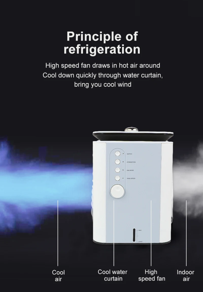 1. High speed fan draws in hot air around. Cool down quickly through water curtain, bring you cool wind. Effectively replenish air humidity and get rid of dry and sultry summer. Let you have a cool and comfortable summer.