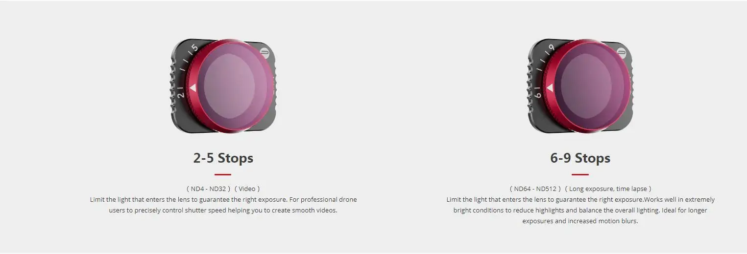 Уменьшение количества входясветильник гарантирует, что камера выбирает правильное значение экспозиции для удовлетворения потребностей профессиональных пользователей аэрофотосъемки для точной регулировки выдержки. В объективе используется Оптическое стекло SCHOTT, шлифовка высокой четкости, изображение высокой четкости, Высокая острота. Применение двухстороннего многослойного нанопокрытия для придания объективу высококачественных водонепроницаемых, маслостойких, противообрастающих и устойчивых к царапинам свойств. Вес фильтра составляет всего 1,5 г. Он имеет конструкцию быстрого крепления и не влияет на калибровку Подвеса.