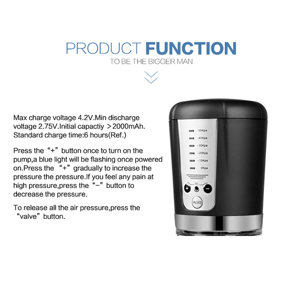 Особенности: Эффективный способ увеличения размера вашего пениса как в длине, так и в обхвате Это также может помочь мужчинам значительно повысить их сексуальную производительность. Примените ФИЗИОТЕРАПЕВТИЧЕСКИЙ вакуумный насос, безопасный и эффективный. Большинство мужчин удивлены увеличением размера своего пениса после тренировки. Все мужчины, которые хотят тренировать пенис. Высокое качество и безопасность АБС, ПВХ, силикон, мягкий, гладкий, нетоксичный и без запаха. Тип питания: USB зарядка, встроенный аккумулятор Материал: АБС + ПВХ + силикон Размер: как на картинке Как использовать: Убедитесь, что все детали надежно подключены. Нанесите немного смазки вокруг силиконового или термопластичного кольца, чтобы уменьшить трение. Аккуратно вставьте пенис, убедитесь, что уплотнение герметично прилегает к вашему пенису. Нажмите кнопку «+» один раз, чтобы включить насос, синий светильник будет мигать после включения. Нажмите кнопку «+» постепенно, чтобы увеличить давление. Если вы чувствуете какую-либо боль при высоком давлении, нажмите кнопку «-», чтобы уменьшить давление. Чтобы снять давление воздуха, нажмите кнопку «клапан». В комплект входит: 1 x насос для пениса Зарядный кабель-1 шт. Другие вложения такие же, как на картинке, которую вы выбираете