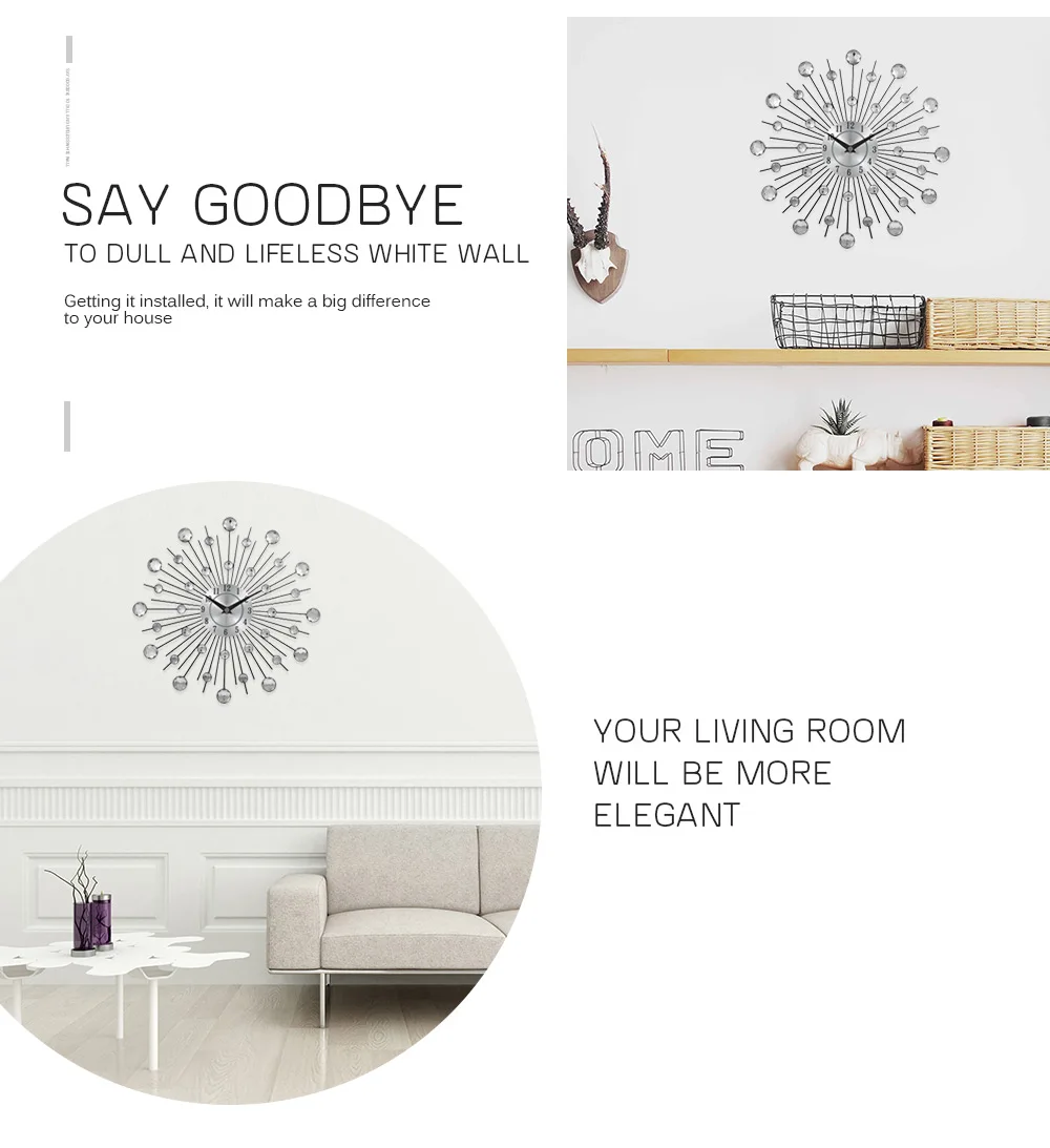 Эти модные настенные часы с кристаллами sunburst выглядят роскошно и благородно, они полны атмосферы искусства. Вам понадобится счастливая жизнь.