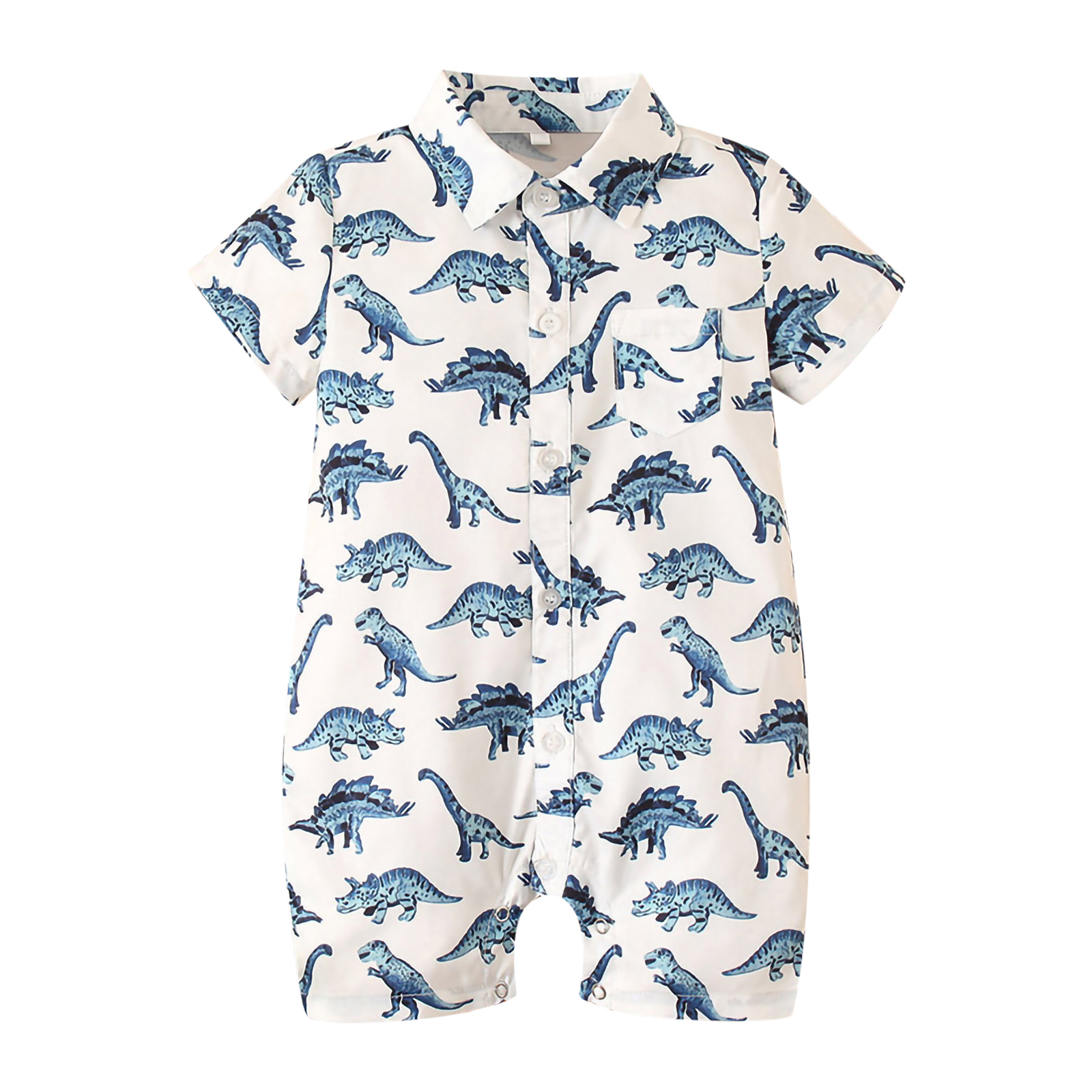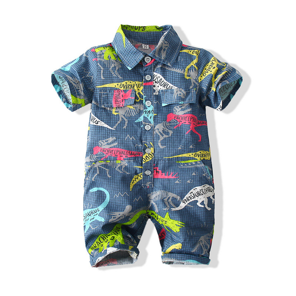 Повседневный комбинезон с короткими рукавами и принтом динозавра для маленьких мальчиков; Цельный комбинезон с отложным воротником; Цвет синий, белый; Одежда для малышей; Комбинезоны