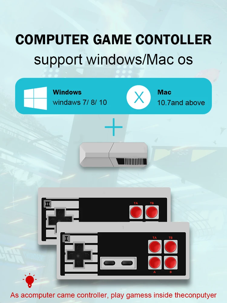 Этот игровой видеоконтроллер поддерживает Windows S7/8/10 и Mac OS 10,7 выше. Примечание: это просто беспроводной контроллер, вы не можете играть в Встроенные игры на компьютере. Но его можно использовать в качестве ручки управления. Вам нужно только установить ключевое местоположение, чтобы играть в свою собственную компьютерную игру!