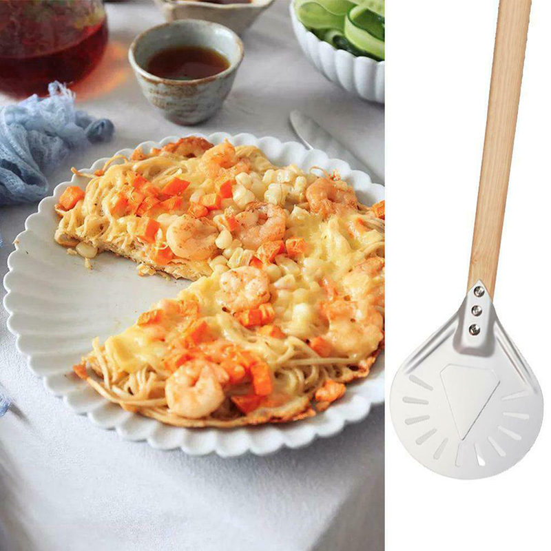 2. Гибкая головка для эффекта скребка: перфорированная кожура для пиццы позволяет использовать меньше кукурузной муки или муки при переносе пиццы с кухонной столешницы в духовку для пиццы, выделяется из нижней части кожуры, делает нижнюю часть пиццы более хрустящей.