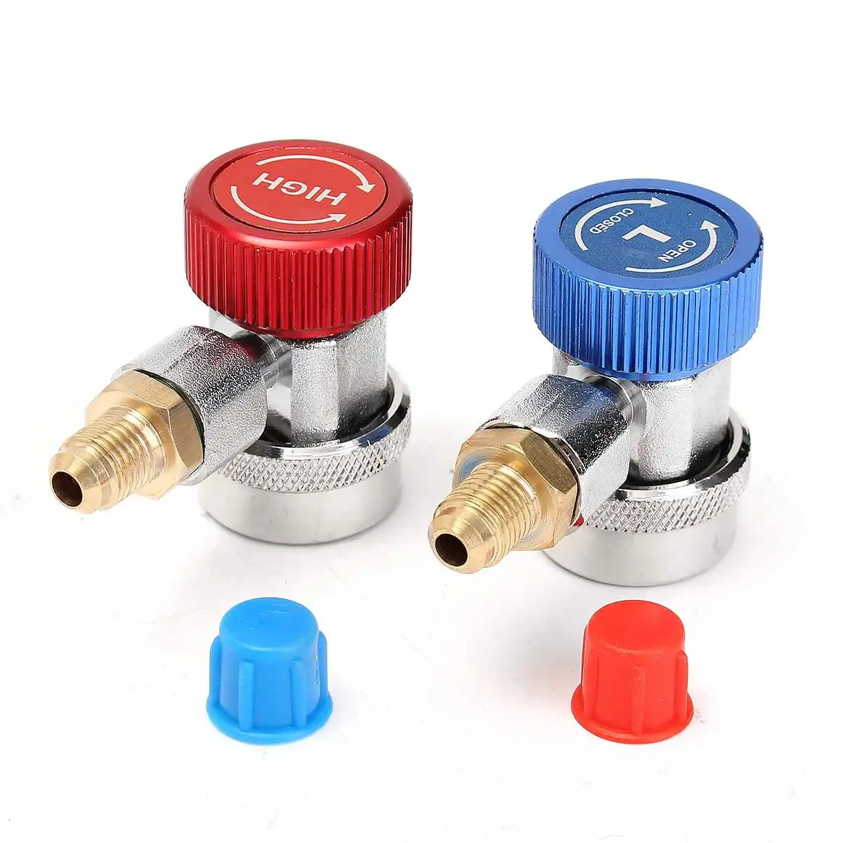 Высокая и низкая R134A быстрая муфта адаптеры Материал: латунь Совместимость: R134 низкая сторона быстрая муфта: синий высокая сторона быстрая муфта: Красный Область применения: автомобиль добавить Фтор синий внутренний диаметр: 14 мм Красный Внутренний диаметр: 17 мм особенность: боковой фитинг для набора манометров A/C (R-134A). Посылка включает в себя: одна пара быстроразъемных (с крышкой s) или 1 синяя БЫСТРОРАЗЪЕМНАЯ муфта с низкой стороной (с крышкой) или 1 красная БЫСТРОРАЗЪЕМНАЯ муфта с высокой стороной (с крышкой)