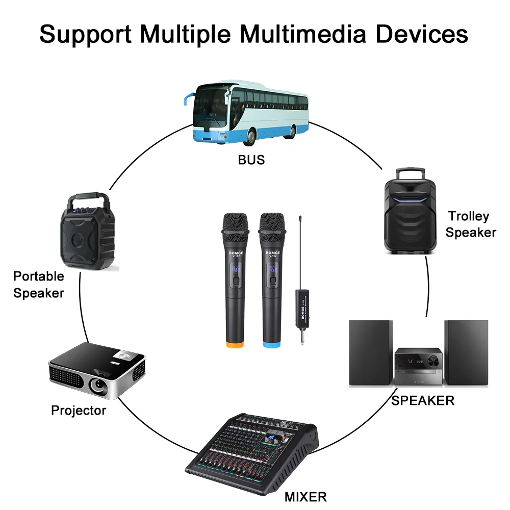 1. Характеристики: двухканальная Портативная Беспроводная микрофонная система BOMGE V-102 VHF, большой дисплей на приемнике + цифровой дисплей на каждом микрофоне, каждый микрофон большой и прочный с приятным взвешенным ощущением, улучшенная высокопроизводительная Беспроводная портативная микрофонная капсула, Эти микрофоны очень чувствительны, что отлично подходит, потому что вы можете держать микрофон подальше от рта и по-прежнему получать чистый звук, включает в себя передатчик с двумя ручными, высокой чувствительностью, однонаправленными, беспроводными кардиоидными микрофонами