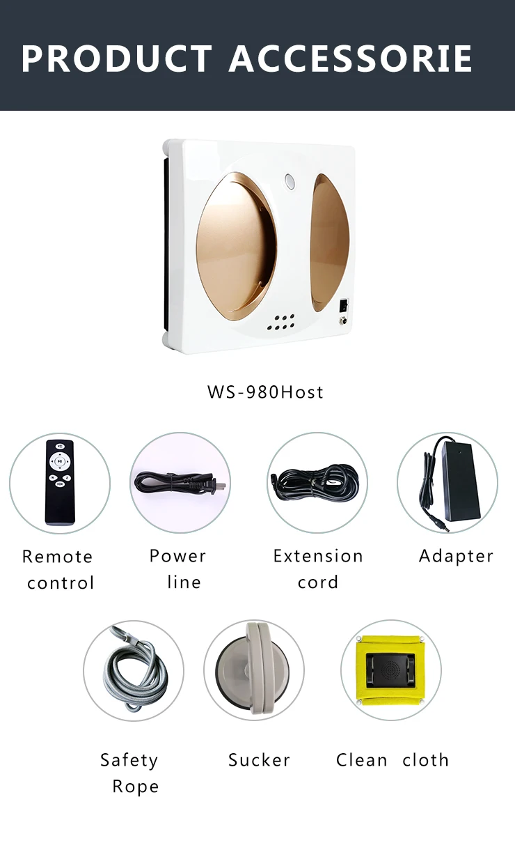 2. Щётка для чистки окон робот WS-980 умный ход навигации. Простые 3 шага операции: Мощность, сосать, старт.