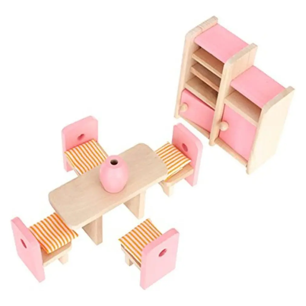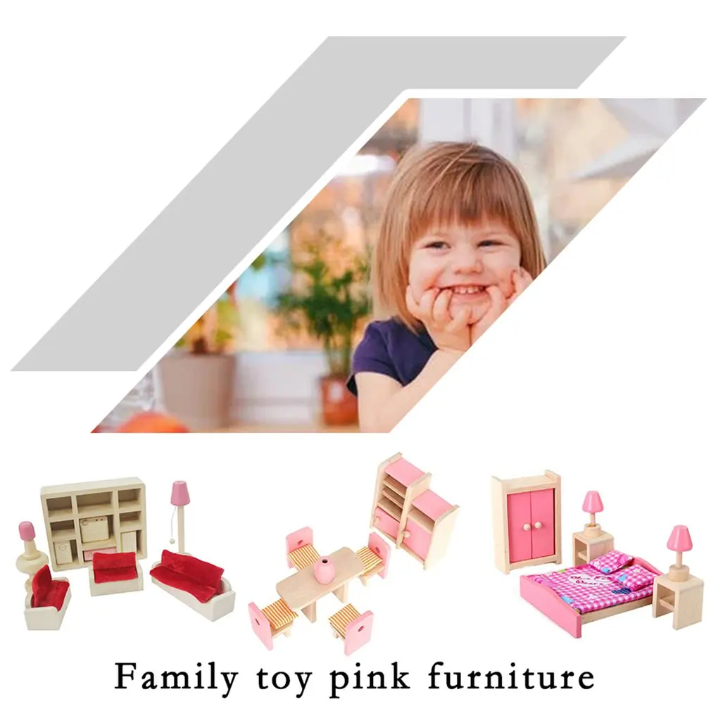 Это игрушечный домик, маленькая розовая мебель, натуральное дерево, безопасные материалы, подходящие для детей.