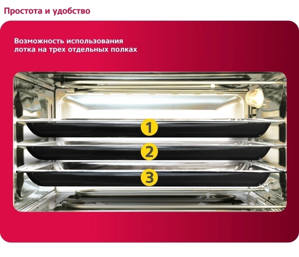 Благодаря разнообразным режимам вы сможете воплотить свои кулинарные фантазии. Встроенный термостат позволит установить необходимую для приготовления блюда температуру. В комплект входят 2 противня + дополнительный противень для крошек.Съёмная металлическая решётка , предназначенные запекания мяса или овощей.