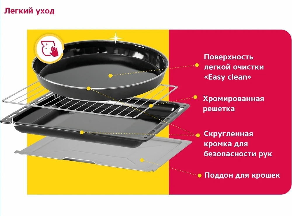 Комплектация стандартный противень, круглый глубокий противень, хромированная решетка, поддон для крошек, инструкция, гарантийный талон.