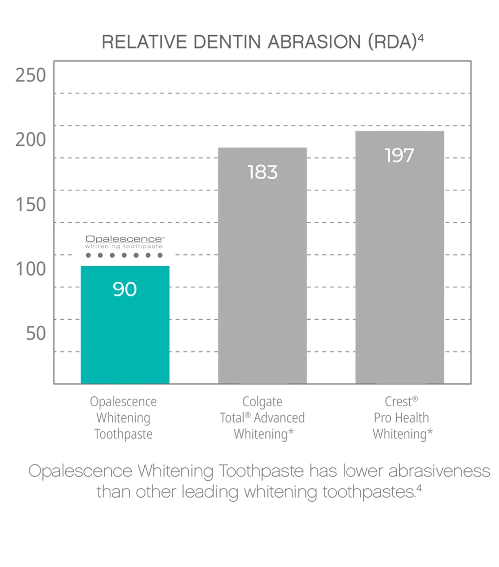 Gentle yet powerful, Opalescence Whitening Toothpaste has been proven to remove surface stains to whiten teeth up to two shades in just one month when used daily. Some whitening toothpastes are too abrasive to use every day3, but Opalescence Whitening Toothpaste’s low-abrasion formula has a lower relative dental abrasion score than other leading whitening toothpastes4. This means it’s both safe enough for everyday use and strong enough whiten teeth fast!