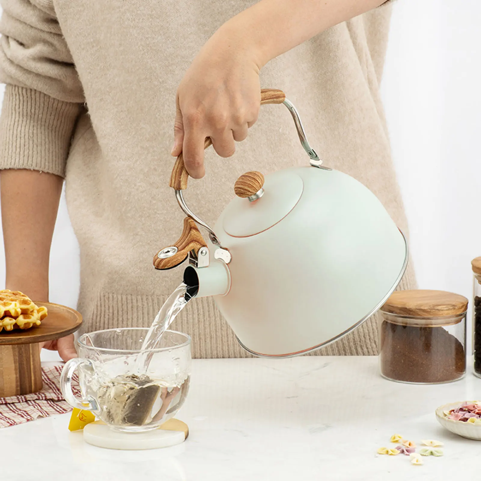 2. Легко налить и заполнить: Эргономичная бакелитовая ручка, удобное сцепление и анти-обжигание. Перевернутая крышка сопла обеспечивает безопасную и легкую заливку горячей воды.3. Встроенный свисток: громкий свисток гарантирует, что вы услышите его звук из других комнат после