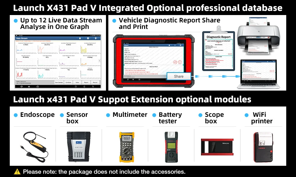 Launch X431 PAD V-это новейший выпуск высококачественного инструмента для диагностики автомобилей. По сравнению с другими серийными x431, launch x431 pad v более профессиональный, более активный тест, больше функций обслуживания, более широкое покрытие транспортного средства. Кроме того, x431 v pad поддерживает ADAS, мини wifi-принтер, осциллограф, датчик мультиметра, тест батареи, эндоскоп и модули анализа зажигания. Но обратите внимание: надстройки в комплект не входят.