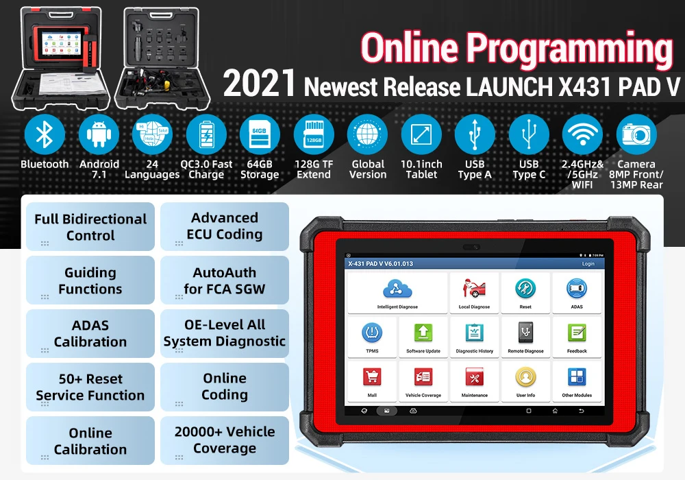Новое поступление LAUNCH X431 PAD V 10,1 дюймов и 5G Wi-Fi профессиональные диагностические инструменты Инструменты онлайн программирования, автоматическая полная система считывания кода сканер с 26 + специальной (сброс) функцией, TPMS, Калибровка системы ADAS, 4 ГБ ОЗУ + 64 Гб ПЗУ (Можно продлить до 128 ГБ)