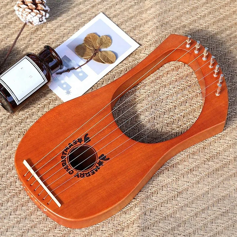 7 стальных струн: 7 металлических нитей, арфа оснащена прочными стальными струнами. Тон звонит и может заполнить всю комнату. Чем короче нить, тем выше тон. А также натяжение струн.