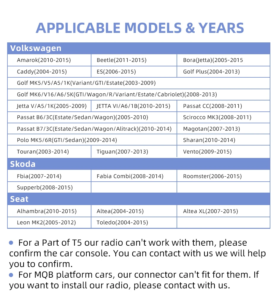 1. Для части f T5, наше радио не может работать с ними, пожалуйста, подтвердите автомобильную консоль. Вы можете связаться с нами, мы поможем вам подтвердить.