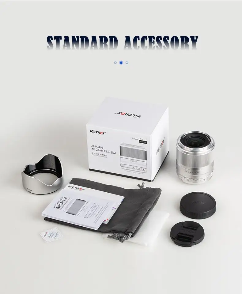 1 x VILTROX AF 23/1.4 Lens 1 x Lens Hood 1 x Front Lens Cap 1 x Back Lens Cap 1 x User Manual