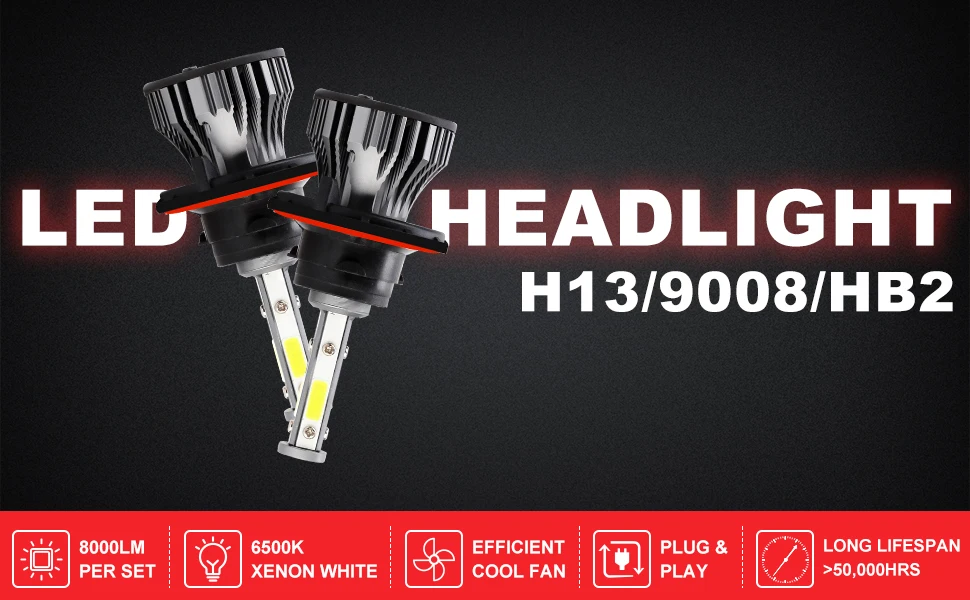 1.Plug Type: H13, High-Low Beam 2.LED type: COB LEDs 3.Power: 60W/set(30W/bulb) 4.Luminous Flux: 16000LM/set(8000LM/bulb) 5.Voltage: DC 9-24V ( Fit 12V,24V Vehicle ) 6.Color Temperature: 6000K-6500K White 7.Beam Angle: 360° 8.Operating Temperature: -40 - +80°C 9.Operating Life: >50000hrs 11.Number of Bulbs: 2 12.To Fit: High + Low Beam Head Lights KIt 13.Placement on Vehicle: Left,Right,Front 14.Material: Aviation 6063 Aluminum Profile 15.Application: Headlight,Fog light (High + Low Beam Head Lights )