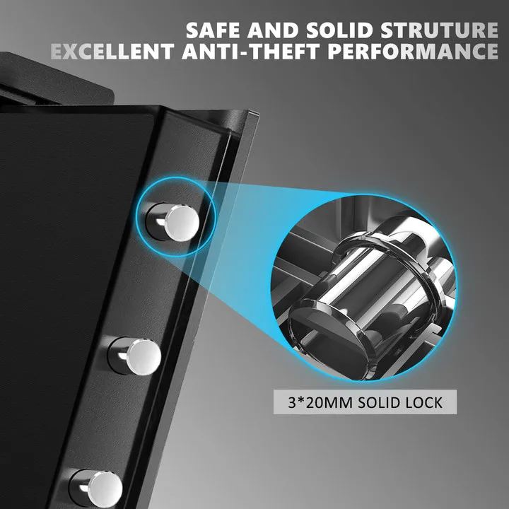 1. Три сломанных болта, толщина 20 мм, усиленная защита 2. Электронная панель паролей, вы можете установить 1-8 цифр пароль 3. Кнопка изменения кода, красная кнопка изменения кода, 1-8 значный пароль может быть установлен и может быть изменен в любое время 4. Низкий уровень заряда батареи для пульта дистанционного управления красный индикатор светильник включен, Указав, что аккумулятор слишком низкий, и аккумулятор должен быть заменен 5. Аварийный ключ, если вы забудете пароль или батарея мертва, вы можете использовать Аварийный ключ, чтобы открыть