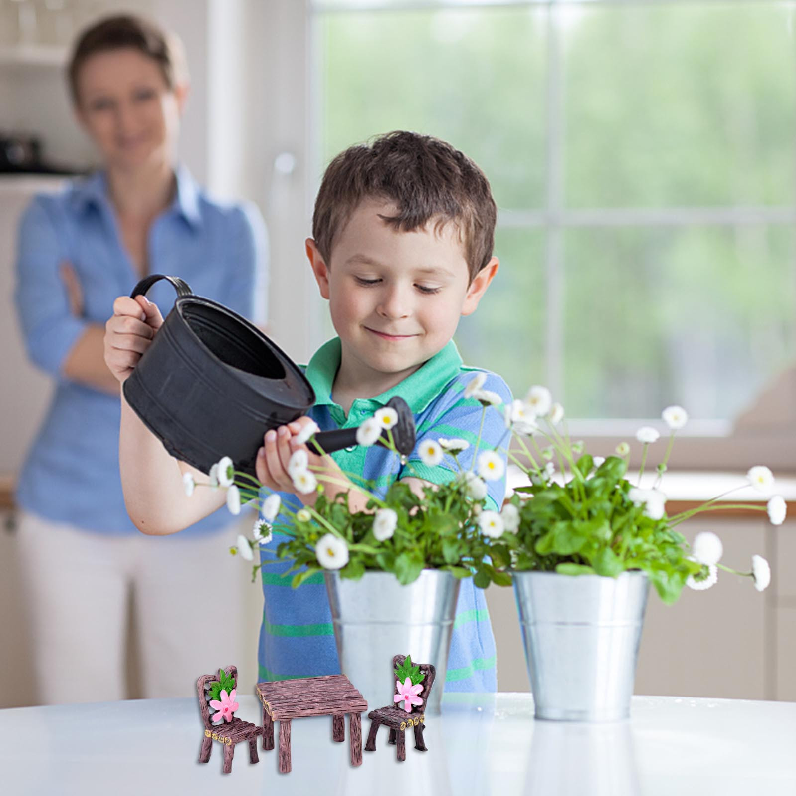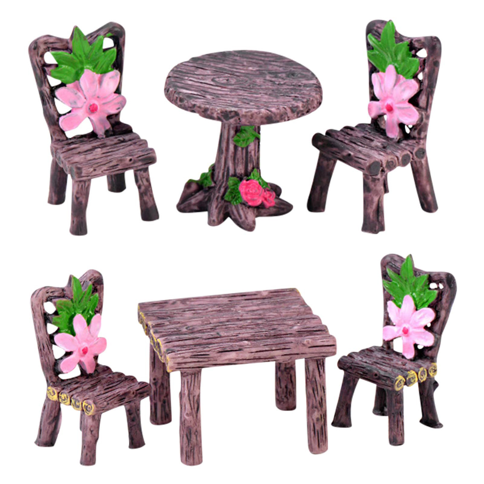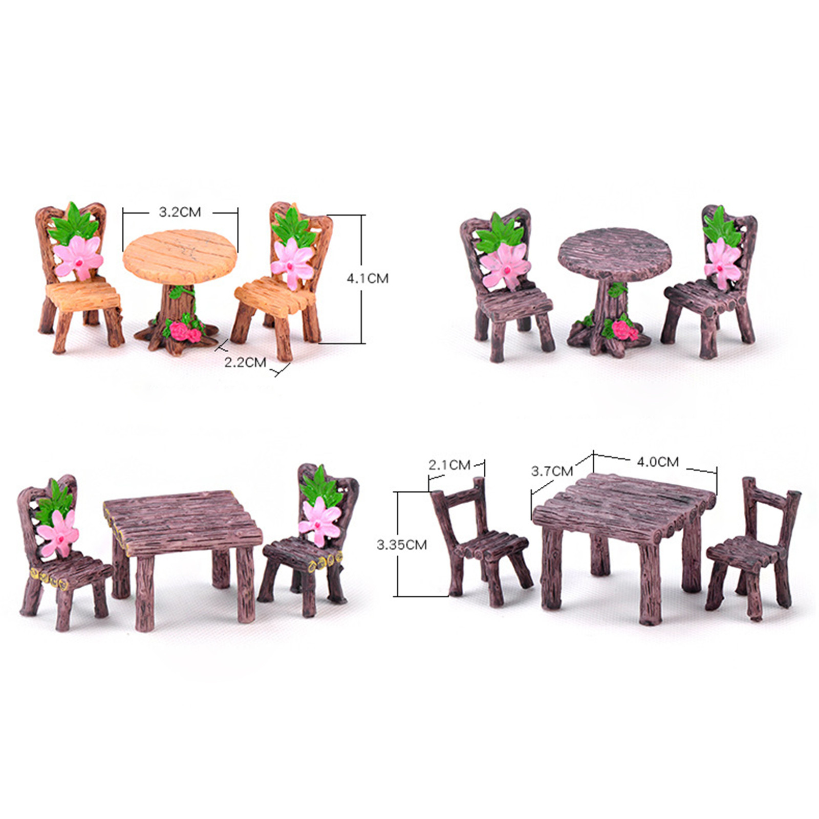 Вы получите 1 комплект из 6 миниатюрных украшений для настольных стульев в 2 различных стилях, включая 3 мини-стула и 2 стола,