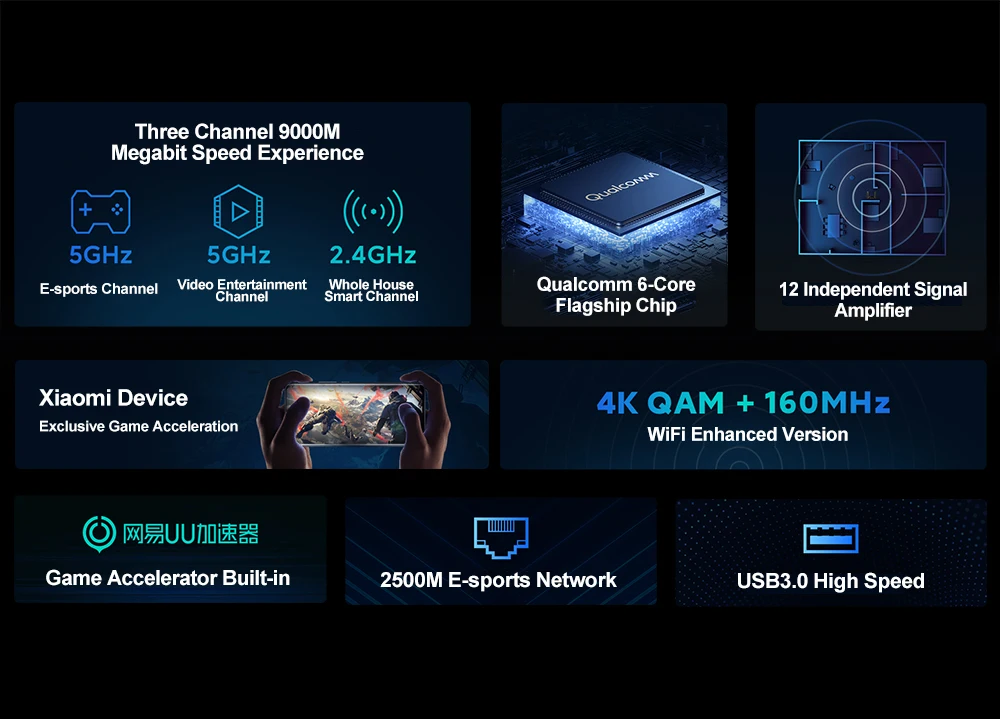 * 1 Гб большой памяти * Трехчастотное совпадение, отсутствие взаимных помех * Эксклюзивный Частотный диапазон игры, ультра-низкая задержка * 160 МГц высокая пропускная способность * 4K QAM Высокоскоростная передача * Мульти-устройство параллельной и эффективной передачи * Устройство, док-станция Qualcomm 6-ядерный флагманский чип * 12 независимых усилителей сигнала * Высокоскоростной интерфейс USB3.0 * WiFi6 сетка гибридная сеть * Автоматическое обнаружение устройства, Настройка сети одним нажатием