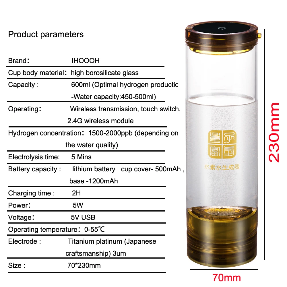 Бренд: IHOOOHМатериал корпуса чашки: высокое боросиликатное стеклоЕмкость: 600 мл (оптимальное производство водорода-Емкость воды: 450-500 мл)Работа: Беспроводная передача, сенсорный выключатель, беспроводной модуль 2,4GСодержание водорода: 1500-2000ppb (в зависимости от качества воды)Время электролиза: 5 минутЕмкость аккумулятора: крышка для литиевой батареи-500 мАч, базовая-1200 мАчВремя зарядки: 2 чМощность: 5 ВтНапряжение: 5 В USBРабочая температура: 0-55 ℃Электрод: титановая Платина (японское мастерство) 3 мкмРазмер: 70*230 ммУлучшает здоровье клеток и улучшает поглощение питательных веществ в организме, используется для мытья лица, легко впитывается для поддержания кожи.