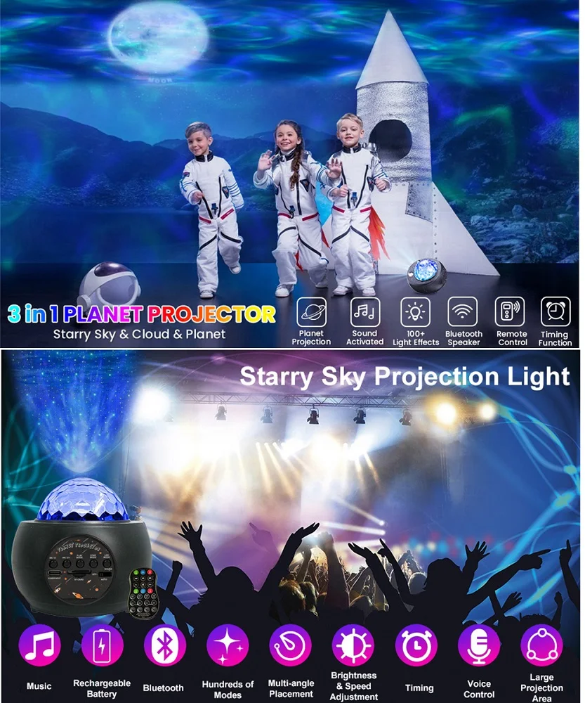 Модернизированный 9 Planets & moon lamp Galaxy Star проектор, небесный свет Lite Звездный Ночной проектор Туманность декор комнаты, Космический проектор для спальни облачная бухта океанская волна свет, время потолочный свет 360 Pro проектор для детей Bluetooth динамик Особенности: 【Музыка Звездный ночной Светильник projector】модернизированный светильник 9 Planets & moon Звездный Ночной светильник может проецировать реалистичное звездное ночное небо на стены и потолок, создавая хорошую спящую среду для детей, 【 Пульт дистанционного управления и musical】с пультом дистанционного управления может управлять звездным прожекторным светильник, красочный светильник s, регулировать яркость, свободно включать/выключать лампу, менять светильник режим ing, музыкальные песни, таймер. Танец с музыкой, новейший режим мерцания с активированным звуком позволяет проекции менять цвет в соответствии с музыкальным ритмом или хлопывать руки, в результате чего происходит проекция звездного неба. 【Bluetooth-динамики и время работы 】вы можете выбрать любимую музыку через Bluetooth или USB, tf-карту для воспроизведения музыки. Высококачественная музыка и проекция звездного неба 【 Автоматическое управление время 】звездный проектор светильник динамической туманности Встроенный-в 1H, 3H,5H, автоотключение таймер, ночной Светильник проектор светильник будет автоматически ВЫКЛЮЧАТЬСЯ через заданное время. И, конечно, таймер может быть отменен, чтобы оставаться на всю ночь. Описание товара: 4 цвета светодиодный светильник держатель лампы beads + зеленый лазер + девять планет и Луны; Светильник Влияние: светодиодный воды узор светильник, лазер Гипсофила Вы можете вставить tf-карту или Bluetooth для воспроизведения музыки на корпусе лампы, вы можете регулировать яркость, вы можете регулировать громкость музыки, вверх и вниз, пауза, выключить/включить, переключатель, USB Android кабель питания. Название продукта: Красочный светильник звездного неба Входное напряжение: DC5V/1A-2A Мощность продукта: 8 Вт Режим электропитания: USB линия электропитания (Мобильная мощность, компьютер, мобильный телефон адаптер) Режим воспроизведения музыки: воспроизведение музыки на мобильный телефон/tf-карту Номер Bluetooth: DQ-M2 Посылка включает в себя: 1X светодиодный светильник для проектора 1 пульт дистанционного управления (батарея в комплект не входит) 1X USB кабель 1X Руководство пользователя