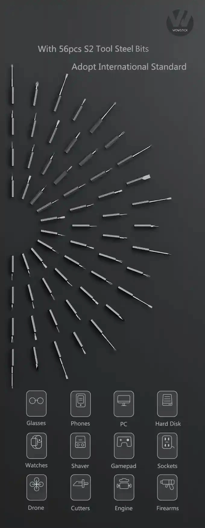 1 электрическая мини-отвертка Wowstick 1 х Wowpad 56 х винтовых бит 1 основание 1 х чехол Wowstick mini 1 X коробка для посылка 1 х USB кабель