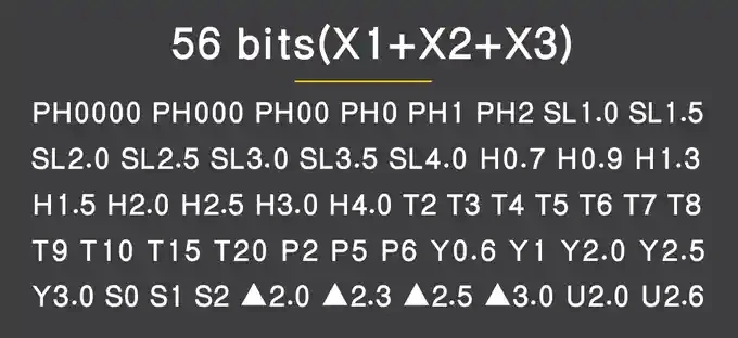 (4x28 мм) отвертка: PH0000/ PH000/ PH00/ PH0/ PH1/ PH2 SL1.0/ SL1.5/ SL2.0/ SL2.5/ SL3.0/ SL3.5/ SL4.0 T2/ T3/ T4/ T5/ T6/ T7/ T8/ T9/t10/T15/ T20 P2/ P5/ P6 H0.7/ H0.9/ H1.3/ H1.5/ H2.0/ H2.5/ H3.0/ H4.0 Y0.6/ Y1.0/ Y2.0/ Y2.5/ Y3.0 SQ0/ SQ1.0/ SQ2.0 U2.0/ U2.6/ U3.0 Треугольник: 2,0/2,3/2,5/3,0 BisonFone0.8 W1.5 (4x45 мм) отвертка: PH0/ PH2/ SL2.0/ H2.0