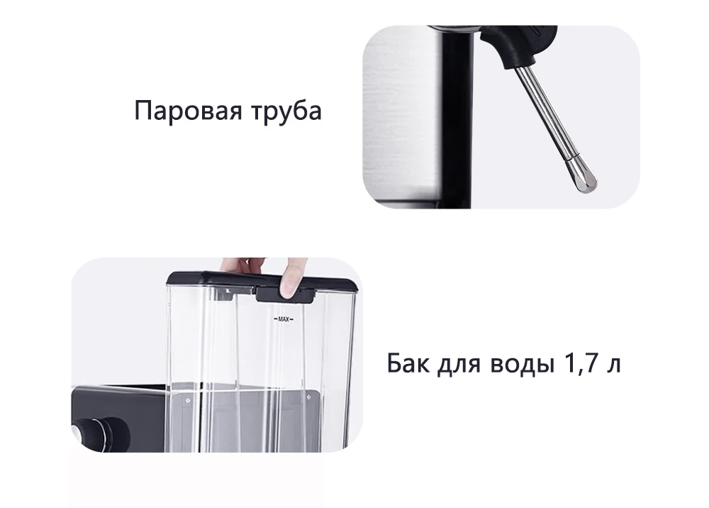 4. Система капучино: независимая Ручка громкости пара, с регулируемым давлением паровой головки на 180 градусов, позволяет легко создавать плотную молочную пену.