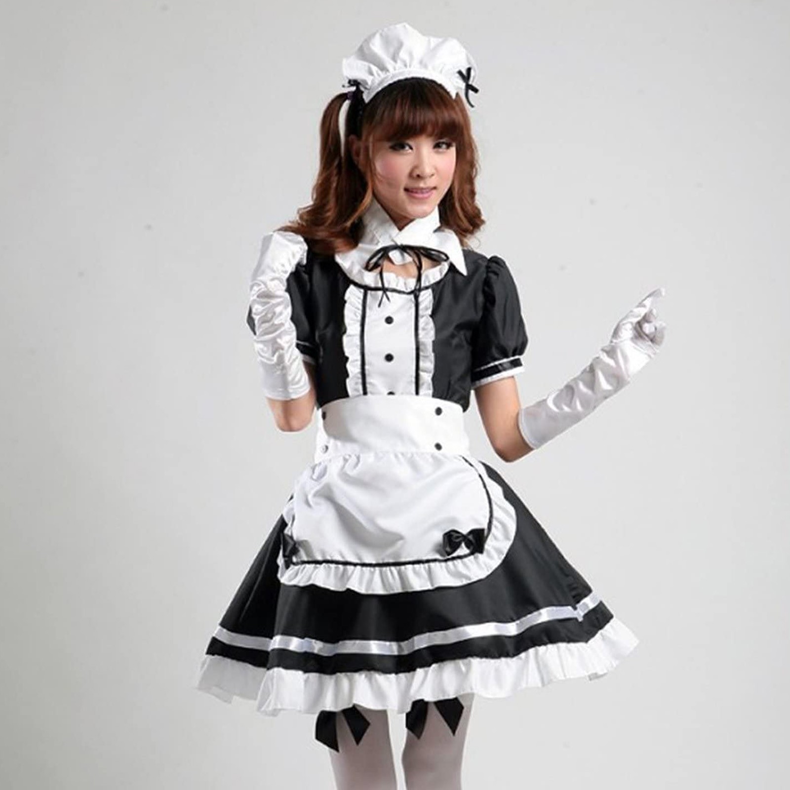 6. Шесть размеров подходят для многих взрослых. Изготовлена из смесового хлопка. Комплектация: платье, фартук, головной убор, галстук.
