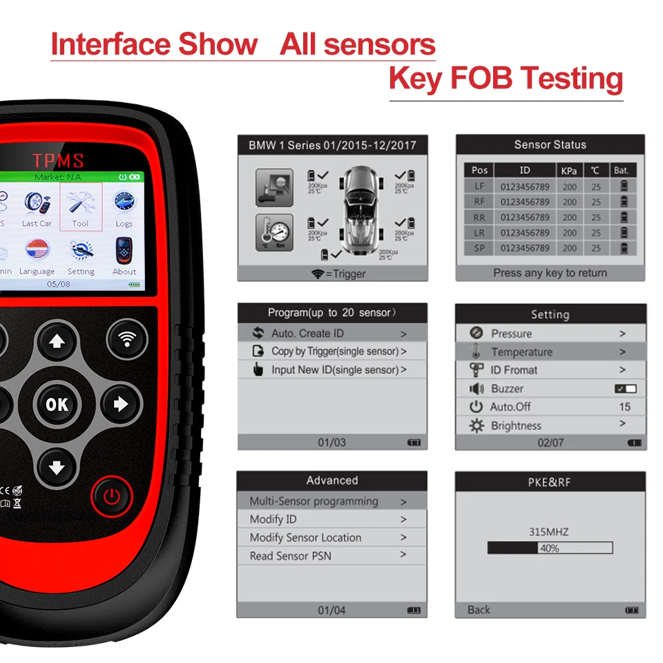 【 Сенсорная программа 】 Программируемый датчик с помощью автоматического создания идентификатора датчика, сканирования идентификатора датчика TPMS и копирования идентификатора в датчик, а также ручного ввода OE ID в датчик 【активация TPMS 】 Активирует все магнитные, частоты, И срабатывает датчик дефляции шин, используемый для систем мониторинга давления в шинах транспортного средства. Retriретранслятор данных датчика Reads считывает данные датчика, включая идентификационный номер датчика, давление в шинах, температуру, состояние батареи и обновляет информацию, чтобы помочь вам проверить состояние здоровья автомобильных шин. 【Программа для чтения guid】relearn procedure guide поддерживает быстрый доступ к неисправным датчикам и помогает вам более эффективно и эффективно завершить проект 【 многоязычный 】 английский, немецкий, итальянский, французский, нидерландский языки
