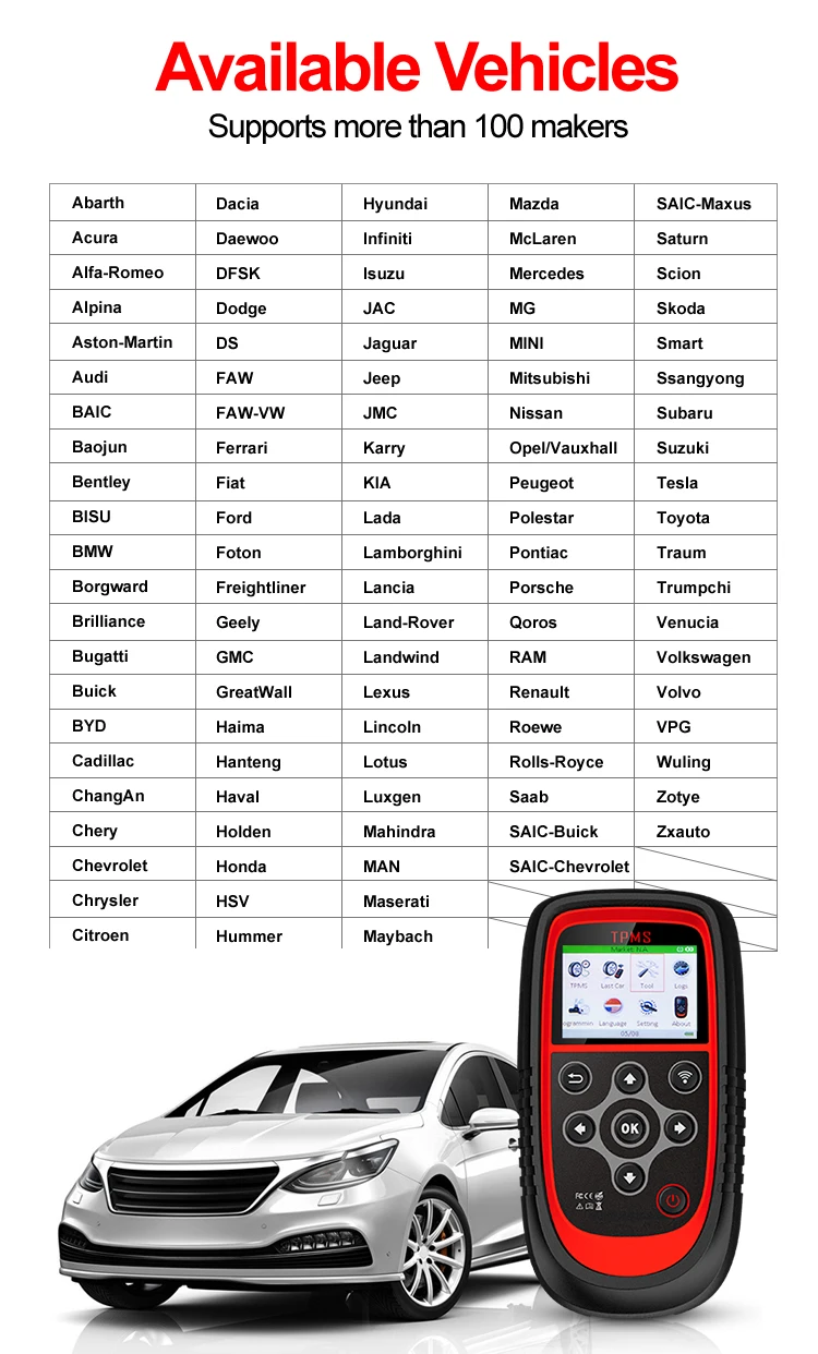 ● Нет повторного обучения после замены ● несовместимый датчик ● Высокая Температура шин ● точно обнаруживает и решает проблемы tpms в обслуживании и замене.